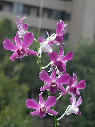 タイで育種されたもので、高温性で乾燥と 日照も好むデンドロ交配種ですが、 濃い藍色の花色はすばらしく、花持ちが非常に長く 3ヶ月も持ちました。 この色彩の洋蘭は大変めずらしと思います。 身長40cmのバルブに40cmの花茎を伸ばして 6cmの花を13輪着けました。 ホテルのロビーや お店の窓辺に 一本挿しで飾られたデンファレの花。 その端正な花に、どれだけ多くの 人たちが魅了されたことでしょう。 あの花自分で咲かせることができたらな。 ポピュラーだけれど高温性であるが故、 家庭での栽培はけっして簡単ではありません。 蘭を育てるの難しくって・・・ そうおっしゃる方の気持ち よ〜くわかります。 (^.^) From Ron |