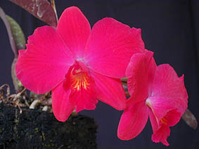 | 流行の交配? Soph.アリゾナはソフロ系の血を注ぐための交配親として、L.スターリースカイは鮮やかな色調の整形花を咲かせる強健な交配親として、この2種のミニカトレアを使うケースが増えているのではないでしょうか。本種はこの2種の交配から生まれたSl.ですから、今後優れた株が選抜されてくることを期待しています。今年の蘭友会主催蘭展でも、本種から入賞株が出たようです。 私が持っている株でさえとても素晴らしいミニですから、いつまでも未登録ではなくて、相応の名前を贈ってあげたいものですネ。 2001年 Sl. Layla という名前がつきました。(^^) |
