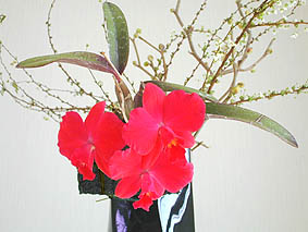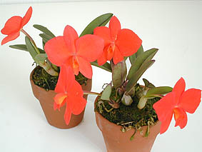 | Soph. コクシネア 昨年12月上旬にホームセンターで求めたコクシネアの開花株。この2株は化粧鉢に寄せ植えされていました。家に着たときにはそれぞれ1輪づつの花しか着いていませんでしたが、今は5輪の花が見られます。白い家具の上に置いて記念写真を撮りましたが、普段は湿度を保つため水槽の中に置いて鑑賞しています。水槽の底には金魚用の化粧砂を敷き、水をたくさんしみ込ませました。部屋が薄暗いものですから、20Wの植物育成用ランプを点けました。温度・湿度が適当だったのでしょうか、かれこれ2ヶ月以上も花のみずみずしさが保たれています。ところでこのコクシネア、お幾らだったと思います?2株に化粧鉢付きで、たったの\1480。どうやら量販店ルートでは、品種に関わらない一律価格設定が定着しつつあるようです。 |