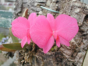 | Sl. Layla (Soph.アリゾナ×L.スターリースカイ) 昨年の春ヘゴに着けたワインレッドのミニに花が咲きました。L.スターリースカイからは深みのある花色を受け継ぎ、フラットに開く丸弁はアリゾナ譲りだと思います。まだ2輪しか開いていませんが後ろにも蕾がもうひとつ残っていて、1バルブから3輪の花が開きそうです。まだ開きはじめで、ペタルがしっかりと開ききっていないのが残念です。手入れは少し面倒ですが、ヘゴ着けは眺めていて楽しいですね。しっかりとした太い根がぐいぐいとヘゴに食い込んで伸びる様子は気持ちのよいものです。 |
