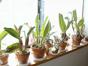 | 日光が射し込む出窓 冬場に花を咲かせる株が多いカトレアは、保温もさることながら採光にも十分気をつかってあげる必要があります。ここは南側2Fの出窓で日光を十分浴びた大型株からは、シースをやぶって大きな蕾みが膨らみ始めています。ちょうど中央あたりに小さな黄色の花が見えますでしょうか?Sc.フェアリーランドのレモンパイが今年もそろそろ開花時期を迎えました。手持ちの2株中、大きな株には4つ、小さな株には1つ蕾みが着きました。開花株は来月の紹介にしたいと思います。 |