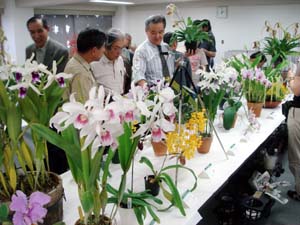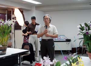 | カトレヤ部門の入賞解説の原さん | 香り審査はいつもの井上さん |