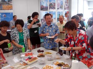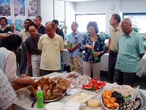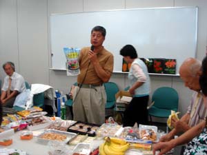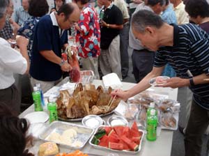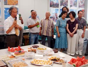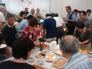 | 8月は恒例の「持ち寄り納涼会」です。 お茶で乾杯し、食事制限も今日だけ解禁の人が・・ | |