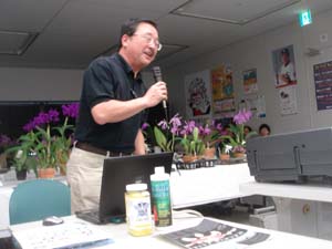 | サンシャイン蘭展(2008/1/5〜8)に 展示予定の中村さん(芸大)の 絵画を紹介する会長と ご本人(左側)です。 |  |