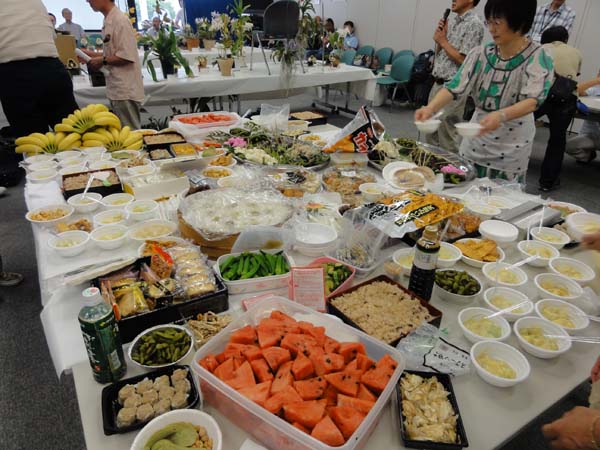 | 審査と発表・人気投票・競りが終わって、やっとテーブルに・・ 恒例の持ち込み納涼会です。 | |
