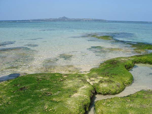 | エメラルドグリーンの向こうに見えるのは伊江島。 | |
