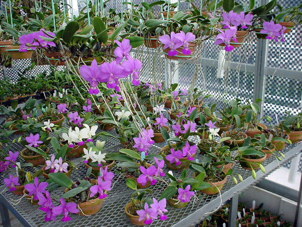 | 恒例の集合写真です。 今年は例年より少し遅い開花で、約40株咲いています。 ほとんどがチポでペローラ系が4株、セルレアが2株、アルベッセンスが2株です。 (映っていないのも含んだ数です) . | |