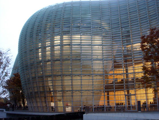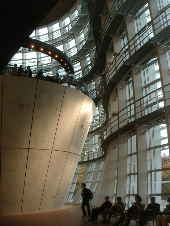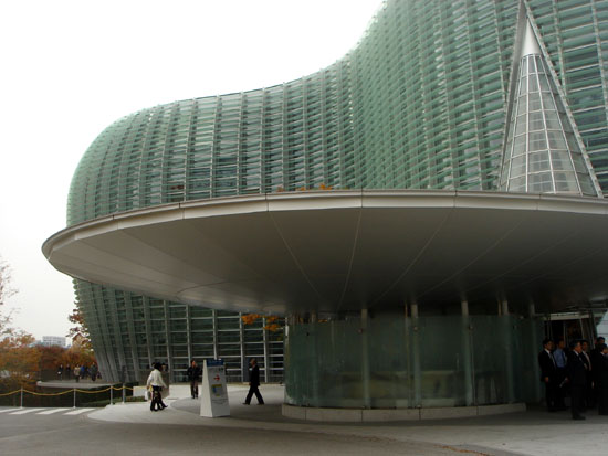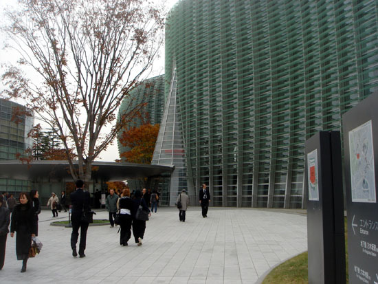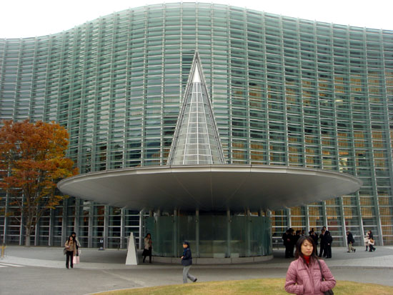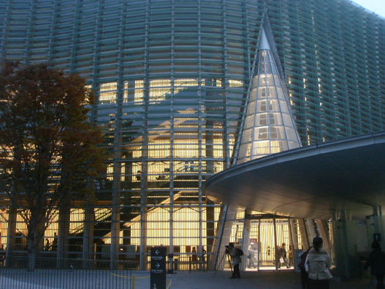| 国立新美術館 六本木の国立新美術館に行って来ました。 バス→電車→メトロ→メトロと3回乗り換えて「乃木坂」に到着。 横浜の家から丁度1時間でした。 建物の全体はこの画像を見てください。 <六本木ヒルズから見た国立新美術館> 設 計:黒川紀章+日本設計 総工費:350億円 延べ面積:48,000u 坪単価:241万円 | |