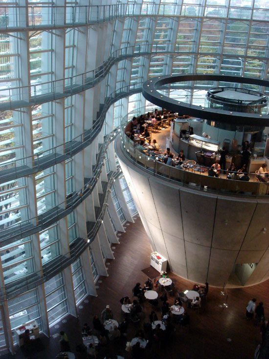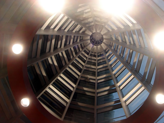 | 20mを超えるアトリウムには逆さにしたコーンが二本、刺さっています。 上部はレストランです。 | |