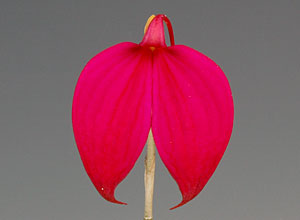 ラテン語のcoccineusは(緋紅色。深紅色)という意味で花色を指す。原産地コロンビアの北部Santander東側山脈の南斜面、標高2500〜3600mの雑木林や岩場に自生する。この美しい蘭は発見後、ヨーロッパに送られ園芸界に大きな反響を呼んだと宇田川先生も著作に書かれています。栽培はコンポストに良質の水苔、素焼鉢が一般的であるが水を好むので、近頃はポリ鉢が多く使われ始めました。