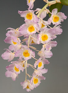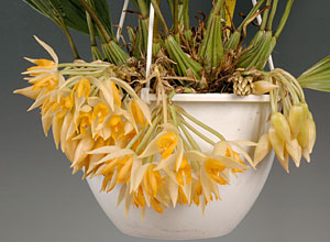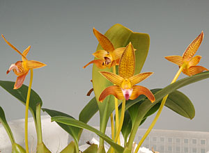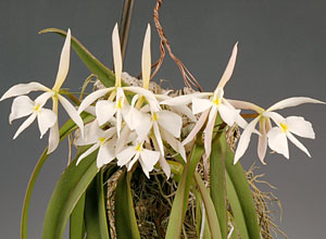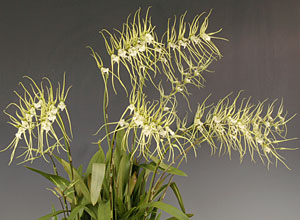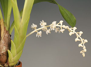 小さい白花を弓状に多数つけます。カトレヤ並みの管理で2,3年作ると太いバルブの大株になります。バルブ下部を包む短い葉に水を溜めると茶色に枯れこむので早めに切り根回りをきれいにしておく。バルブが充実すると両脇から2本の花が上がり見応えがある。
