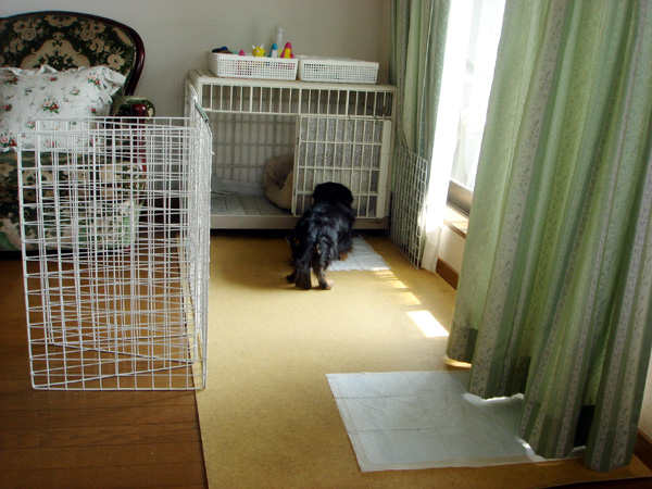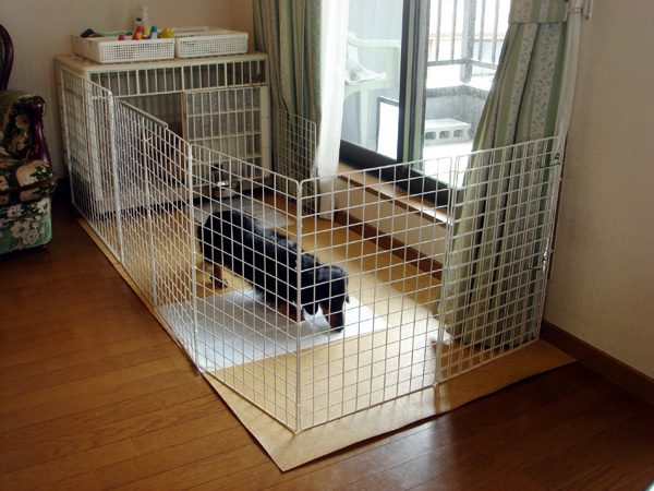 | 夜間(11時〜7時)はサークルにトイレシートを置き、サッシとカーテンを閉めています。 朝まで我慢できない時はシートで済ませています。 |