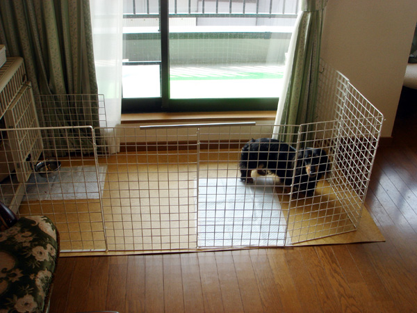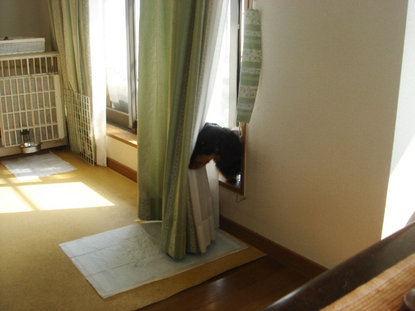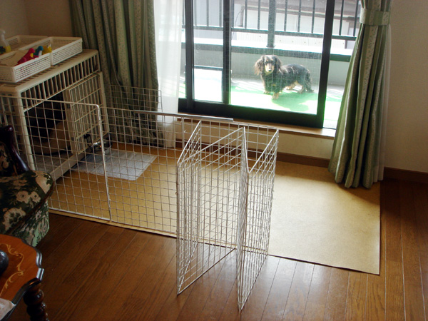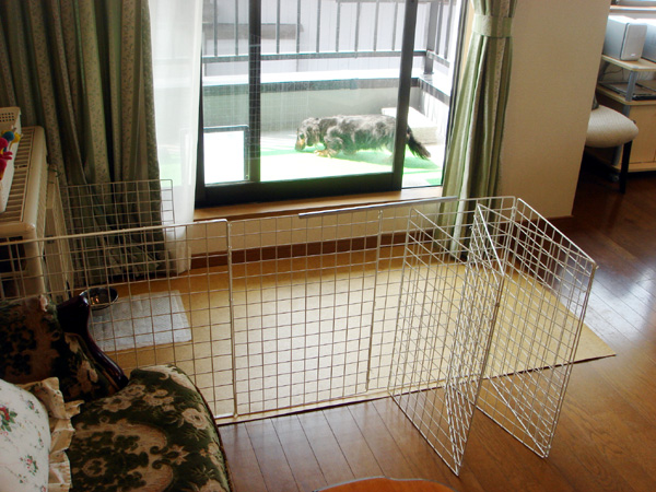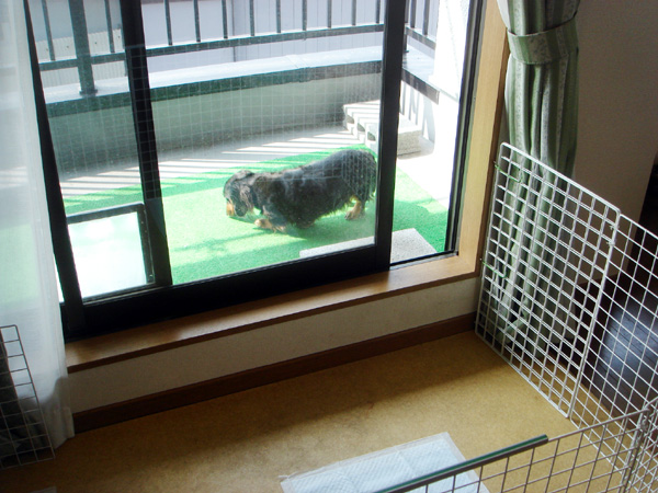 | 朝はまずベランダに出てオシッコを済ませます。 外出時はこの状態でベランダに出られるようにしておきます。 (雨の日と風が強い日は閉めておきます) |