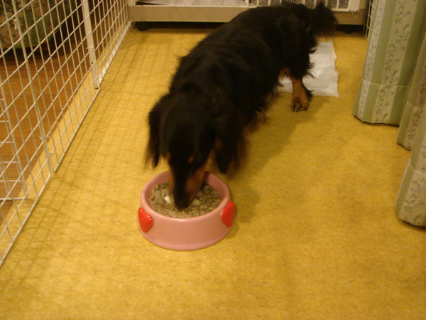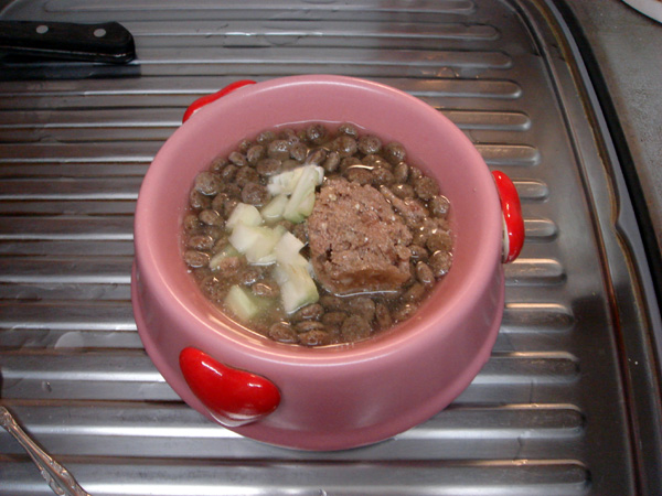 | 食事は6時過ぎの一回だけ。今日はいつものナチュラルハーベストと ローフォスフェライスにキャベツの芯をチンしたものをトッピング。 運動量が少ないので量も少なめです。 食事の準備中はいつも走り回っています。時々吠えることもあります。 |