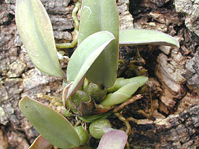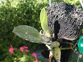 ヘゴに活着したSl.オルペッティ 今春、ヘゴに着けてみたSl.オルペッティです。写真では良く分りませんが、太い根が何本かしっかりとヘゴへ食い込んでいます。右下の2つのバックバルブは6月にヒョウに打たれて葉を落としたバルブです。完成している唯一のバルブがその時の新芽。ヒョウがかすめた傷跡が少し残っています。その株元からは今シーズン2つ目の新芽が伸びだしており、オルペッティの生命力の強さをあらためて感じました。ソフロ系ミニカトレアの中には、オルペッティのようにこれから年末へかけて成長を続ける株がたくさんあります。そんな株には新芽の成長の具合を見なら3000倍以上に薄めた液肥を継続して与えておいても良いかもしれません。 |