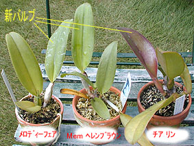 スタンダード小苗の生育状況 鉢の置き場所に困るので、大きくなる普通種は極力控えているつもりなのですが、ミニカトレアのような小苗を見るとついつい家に連れて帰ってしまいます。左の3鉢は、いずれも開花サイズまであと2年以上は作り込まねばならない普通種の小苗です。一番左のメロディーフェアは今年通信販売で手に入れた’キャロル’です。あちらこちらの蘭展で入賞を繰り返すこの花は、セミアルバの最高峰の一つであるとも解説されます。真中は、とてもデッカク成長すると脅かされているメモリアヘレンブラウン。グリーン系の銘花です。右のチアリンは言わずと知れた深紅の大賞花。どの株も新バルブの大きさが、昨年よりそれなりに大きくなっていますので夏の管理はボチボチだったのかな〜、と振り返っています。これから迎える無加温の寒い冬。我慢してもらいますぞ。よろしく頼みますよ〜。 |