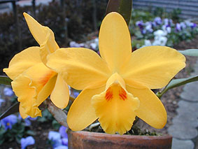 | Sc. ビューフォート ’クレイイアー’ 11月に蕾が上がってきたことをご紹介したビューフォート。12月下旬に2輪の花が開きました。黄色系ミニカトレアの多くがビューフォートを片親に持つことから、交配親としての優秀性が高く評価されています。交配親としては優秀ですが、性質の気難しさという園芸品種としての改良課題を残した良花です。せっかく上がり始めた蕾を途中で落としてしまわないように、大事に大事に開花を待ちました。私はこの花への思い入れを引きずって大事に育てているのですが、今に至ってはわざわざ本種を選ばずとも、花型や色彩に大差がなくずっと育て易く花つきも良い改良種が流通するようになっております。黄花系ミニの重要な交配親としてブリーダーや趣味家によって今後も栽培しつづけられることと思いますが園芸品種としてはその役割を次の世代に譲った銘花です。 |