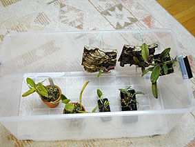 | コルク着けの置き場所の工夫 コルク着けやヘゴ着けが蘭の生理に適していることは広く知られておりますが、家庭での実践となると大きな障壁があります。それは置き場所の問題です。素焼き鉢にミズゴケの組み合わせならコンパクトだし、潅水も容易です。しかし、コルク板となると躊躇される方もいらっしゃるのではないでしょうか。私は、ホームセンターで安売りされている大きなプラスチックの衣装ケースをコルク着け置き場に流用しました。この大きなプラケースって、結構安いんですよね。300円台ですから驚きです。ちょっと気をつければ周りを濡らさずにシリンジできるし、そのまま窓際に移動すれば日光を通してくれるし、夜間にふたを乗せれば簡易保温・保湿ケースです。コルク板だって、針がねで縁に引っ掛ければOKです。如何なもんでしょう? |