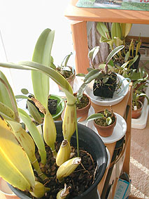 | リビングの窓際 今年の冬はリビングの窓際を占拠することができそうです。昨年までは子供が走り回るリビングに、大切な鉢を並べておくことは、どうなってもかまわないことを意味しておりました。今年は秋口から私の目の届く休日だけ並べ始めてみたところ、子供たちも女房も少しづつその存在を意識してくれるようになったようです。ここに鉢を置けることは、昨年までの完全無加温状態とは雲泥の差があります。完全無加温の2階の出窓は、夜間明け方に10℃を切ることが常でしたので、今年はカトレア達も安心して冬を乗りきる事が出来そうです。 昼間は暖房を入れませんが、日当たりが良いので真冬でも室温は15℃程度に保たれます。夜間の暖房は12時頃までですが、明け方5時頃には再び暖房が入りますので、底冷えのする寒さに長時間株を曝してしまう心配もほとんど無くなりました。例年なら、今頃になると株の成長は一切ストップするのですが、今年はまだ株に動きが見られます。一番手前の大鉢は、春咲き種のLc.アイレンフィニー。今が新芽の成長真っ盛り。交配改良されたミニカトレアならば、この程度の環境でもしっかりと育ってくれます。 |
