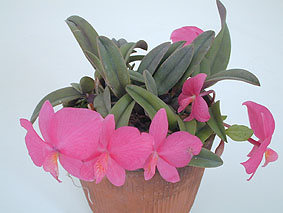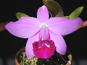 | L. プミラ 今年もプミラが花を咲かせてくれました。たったの一輪でしたけれど、昨年よりひとまわり大きな立派な花でした。 ミニ種(Lc.やSl.やSlc.)の多くが本種の血を引いて改良されます。原種ブームの真っ只中、プミラの人気がいまひとつなのは何故なのかな〜と考えます。先日、東京大丸デパートの屋上にある蘭店の温室で、プミラの立派なコルク着け大株を見ることが出来ました。特に夜間の十分な給水を好むと言われる本種も、キメ細かく手をかけてあげられれば、給水と乾燥のサイクルをしっかり操作できるコルク着けが適するのか、と感心した次第です。低温にも強く性質は強健ですが、手を抜くと花が咲かなくなると言われるプミラ。来年は是非とも2輪の花を咲かせてみたいとおもいます。 |