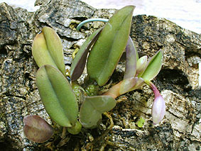 | 新芽を割って蕾が見えたSoph.ウィッチジアナ ウィッチジアナはやはりコルクとの相性が良いようです。ソフロの中でも比較的高温に耐えると言われる本種ですが、ミズゴケ植えでの管理はやや難しいと感じておりました。春からコルク着けに切り替えたところ、根の伸びは格段に良くなり今シーズンは立派な新芽を2つも吹いています。果たして蕾が入るかどうか、ちょっと自信がなかったのですが、両方とも蕾が顔を出してくれたときの嬉しさと言ったらもう。。。。。本種のコルク着けはソフロがお好きな方々に是非とも一度は試していただきたい育て方だと思います。参考程度に。コルクはあっという間に乾くので、真冬の現在でも出来れば朝と晩、1日2回タップリと水をかけてやっています。 |