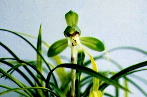 花は、中虎斑花。葉は、始め蛇皮、後に白虎斑になる。