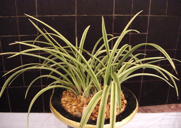 葉全体に散り斑縞で特に葉面中央に斑柄を鮮明に表す。
