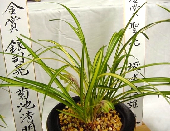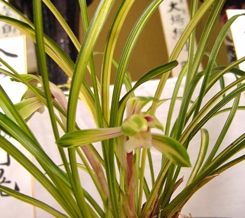 濃緑地の大葉性半立ちで、黄白色の中透け縞斑を表わす。