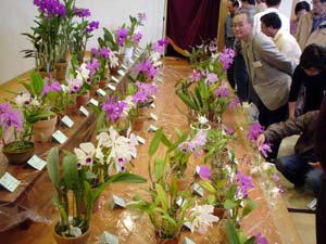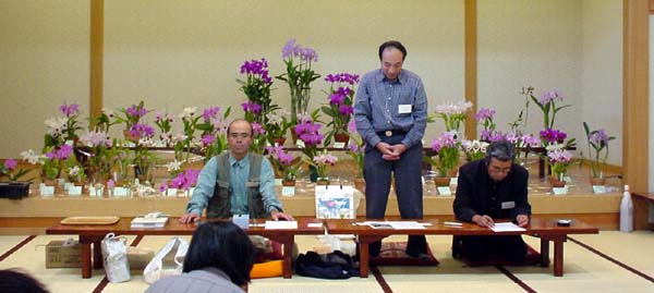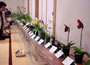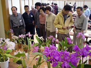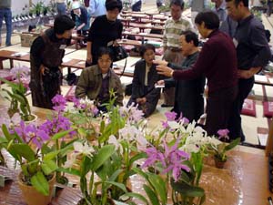 ↑レベルの高いカトレヤ系原種の展示です。 ←↓準備段階から花談議で盛り上がっていました。 行事は、KTS副会長の澤井さんの スライド講演でした。(画像なし) |