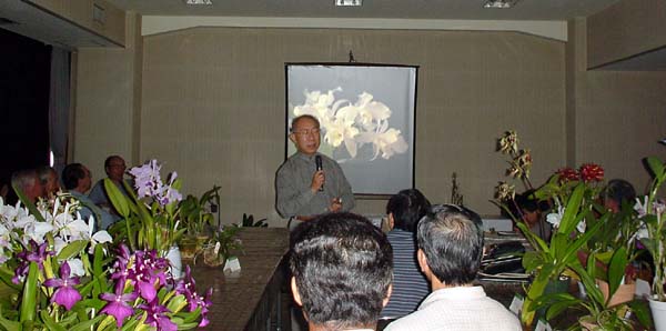 | 今月のテーマ「蘭の写真とそれにまつわる余話」 福原会長のご自身撮影のスライド講演でした。 . |