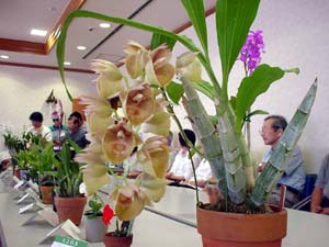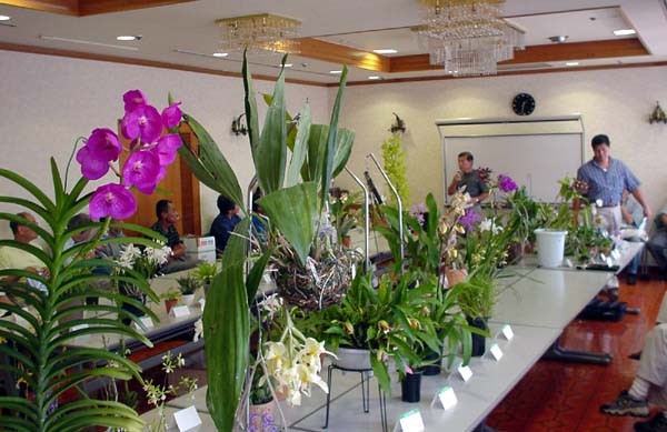 AJOS 8月例会 労働スクエア東京(Roudou Square Tokyo) 平成14年8月11日 出席者 46名 出品株 73株 今月は会場の都合で銀座で行いました。 * All Japan Orchid Society Aug.11.2002 46 members 73 plants . |