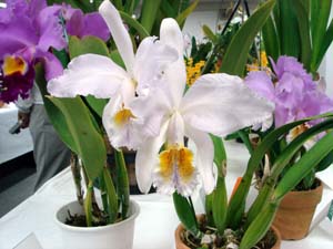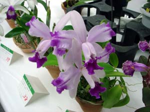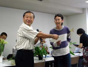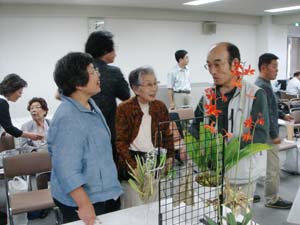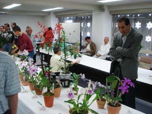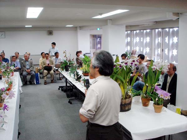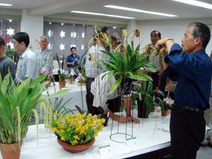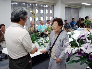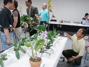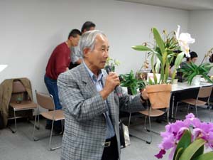 | カトレヤ部門の入賞解説の原さん | 香り審査はいつもの井上さん |