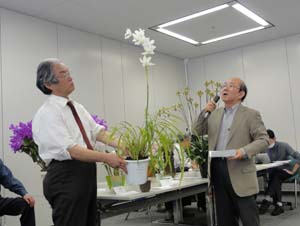 | 審査解説の田中会長と世田さん | 香り審査解説の井上さん |