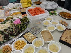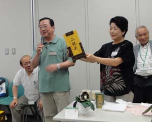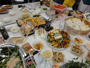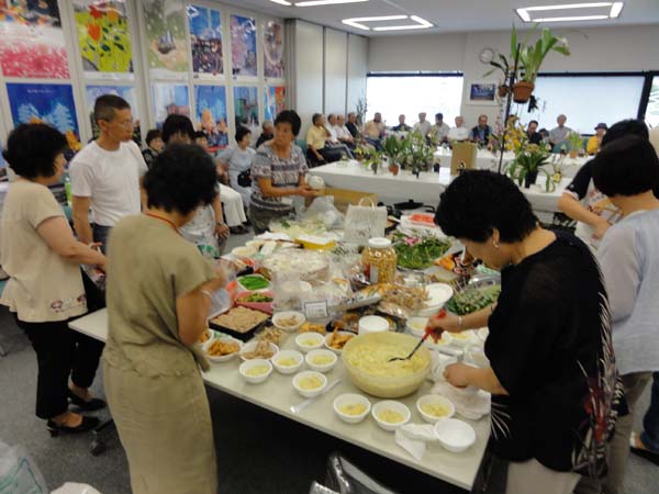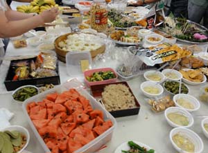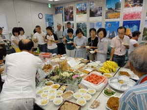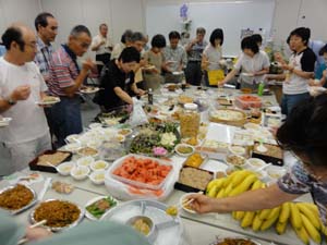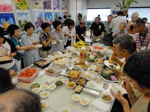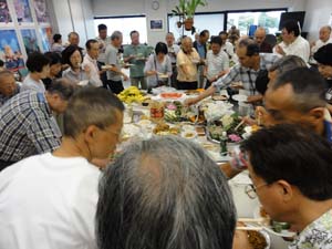 審査と発表・人気投票・競りが終わって、やっとテーブルに・・ 恒例の持ち込み納涼会です。 |