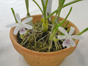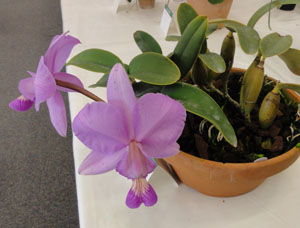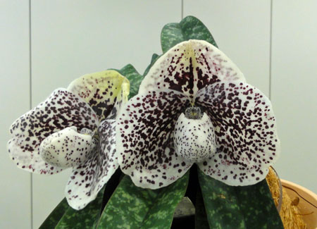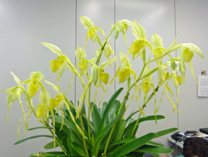パフィオ・オトゴゼンの大輪整形花が FCCの94点で入賞しました。 斉藤会長の出品です。 花の後ろに蕾がふたつ控えています。 |