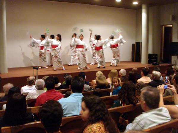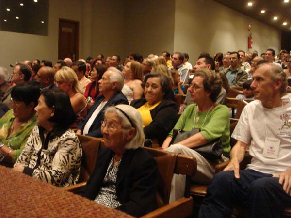 | ベロ・オリゾンテにも日本人会があって300人ほどが参加されているそうです。 95歳の二世のご婦人や会に貢献された方に記念品が贈られた後に、 以前は若かった方々のなんとか音頭です・・ |