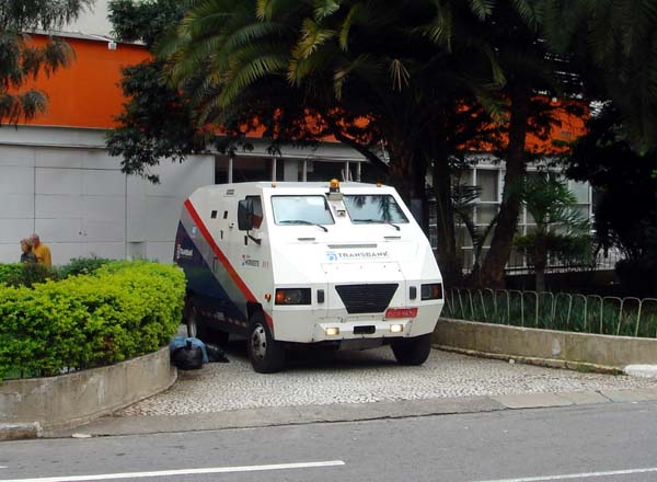 | 銀行の前に停まっているのは装甲車並の現金輸送車です。 | |
