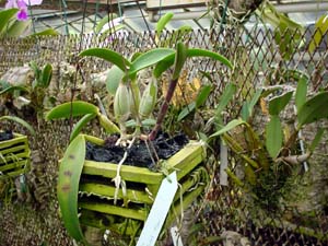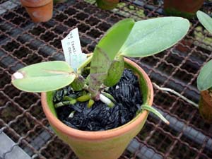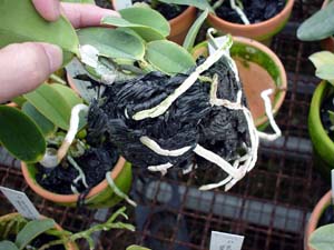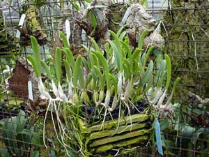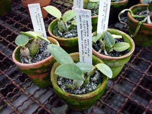 −栽培ポイント− 使用されているコンポストは、遮光ネットです。 素焼き鉢かバスケットに、かたく植え込みます。 プラ鉢では過湿になります。 水やりは、素焼きに水苔と同じペースにすると、 丁度、乾かしぎみの管理になります。 シルバーの方が陽が強い時の水やりで ムレにくいそうです。 |