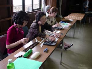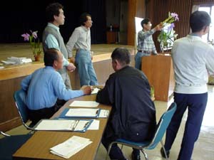 恒例の株交換会 ←写真で花を説明(親切ですね) ↓左 競り落ちると落札者を出品リストに記入。 ↓右 落札者別に集計する。 |