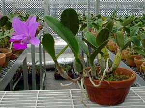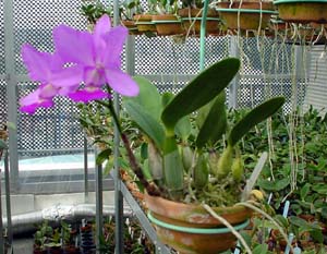 | 葉付きバルブに着花(5号鉢) | 花バルブに着花(4号鉢) |