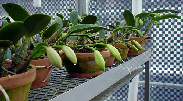 | 恒例の集合写真です。 今年は例年より少し遅い開花で、約40株咲いています。 ほとんどがチポでペローラ系が4株、セルレアが2株、アルベッセンスが2株です。 (映っていないのも含んだ数です) . | |
