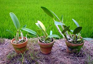 株の大きさの比較 左側:C. walkeriana 'Jungle Queen' MC バック吹きの株、バルブ+葉で 22p 中央:C.lueddemanniana var.semi-alba 'Stanleyi' OG トップバルブの長さ 20p 右側:C.lueddemanniana の一般的なサイズの株 トップバルブの長さ 30p |