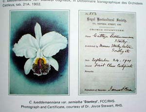 左は スタンレイが、RHSでFCCに入賞した時の記録で C. lueddemanniana 'Stanleyi' と、個体名に ' i ' が 付いた綴りになっています。 ( September 24. 1901 ) −91頁に紹介されています− ↓リップの周辺は白色で、ハッキリとした筋状の脈が 入っているのが分かります。 |
