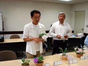 行事 (1)-1 研修審査(議長:西村さん) (1)-2 ノビリオールについて(担当:山下さん) (2) 合同例会のアンケートほか(担当:山下さん) (3)株交換会(司会:田村さん) (4) 「ノビリオールについて」パネルディスカッション(司会:佐藤さん) (5) 入賞花・出品花の解説(西村さん+石野さん) . |